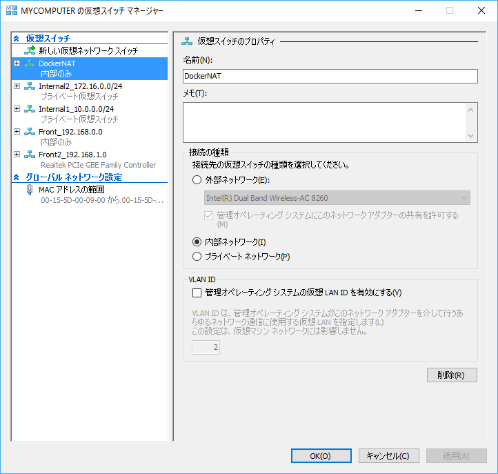 そこで、Hyper-V仮想ネットワークの設定を見ると、自動的に「Docker-NAT」という仮想スイッチが内部ネットワークとして作成されていることがわかります。